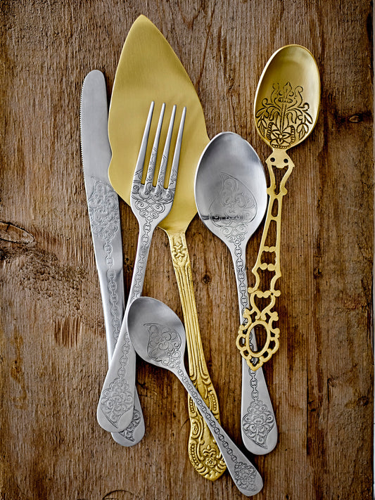 Ανακαλύψτε την τέχνη του φαγητού με τα εξαιρετικά μαχαιροπίρουνα και κουτάλια μας. Κάθε κομμάτι είναι ένα έργο δεξιοτεχνίας, σχολαστικά σχεδιασμένο για να μετατρέψει τα γεύματά σας σε στιγμές συντροφικότητας. Το βάρος του πιρουνιού, η καμπύλη του μαχαιριού και η απαλή καμπύλη των κουταλιών μας συνδυάζονται για να δημιουργήσουν μια ξεχωριστή εμπειρία. Καθώς απολαμβάνετε κάθε μπουκιά, τα μαχαιροπίρουνα και τα κουτάλια μας θα σας συντροφεύουν, κάνοντας κάθε γεύμα μοναδικό. Φέρτε τη γοητεία του χειροποίητου στο τραπέζι σας και απολαύστε τις στιγμές σας.