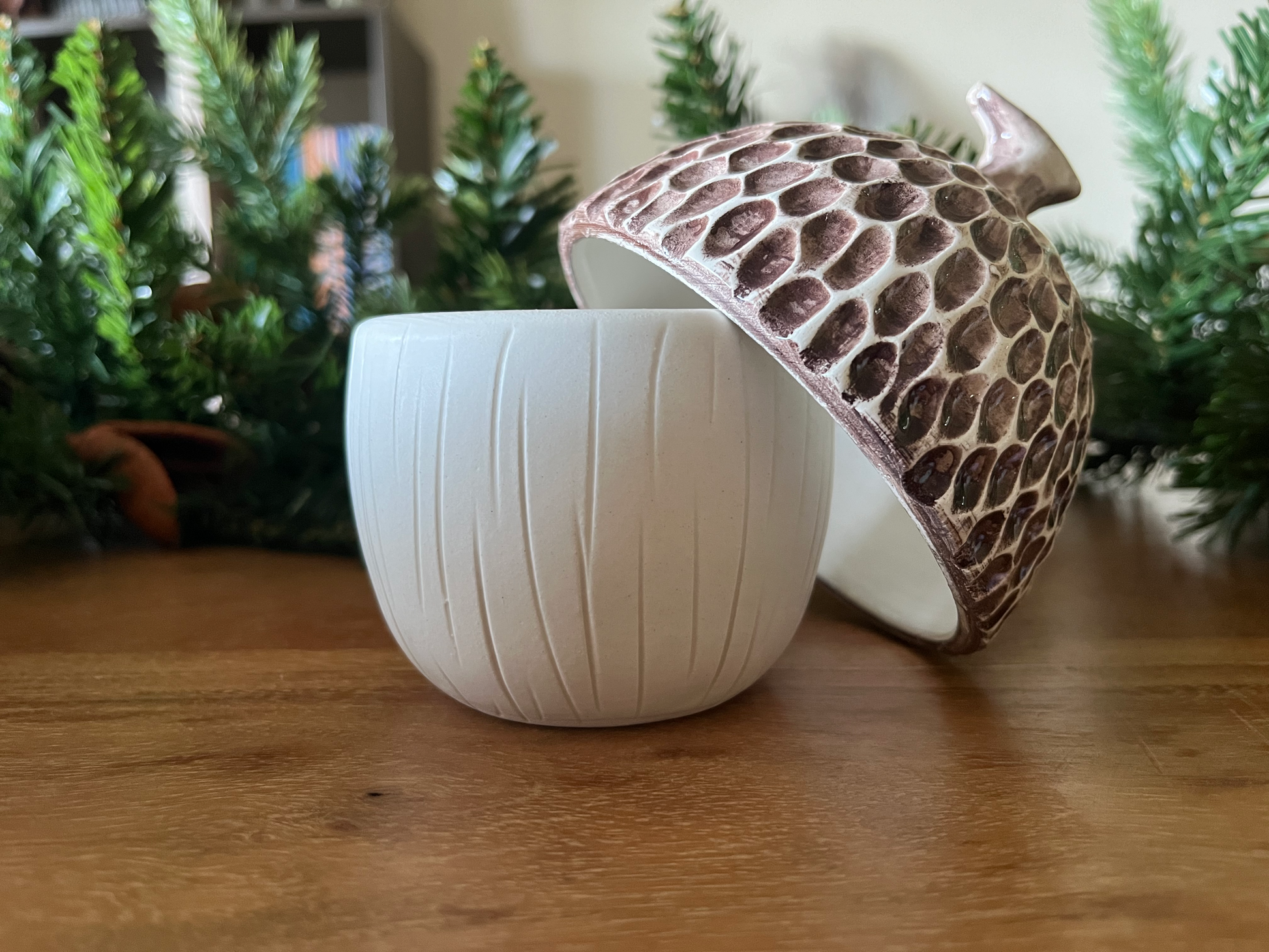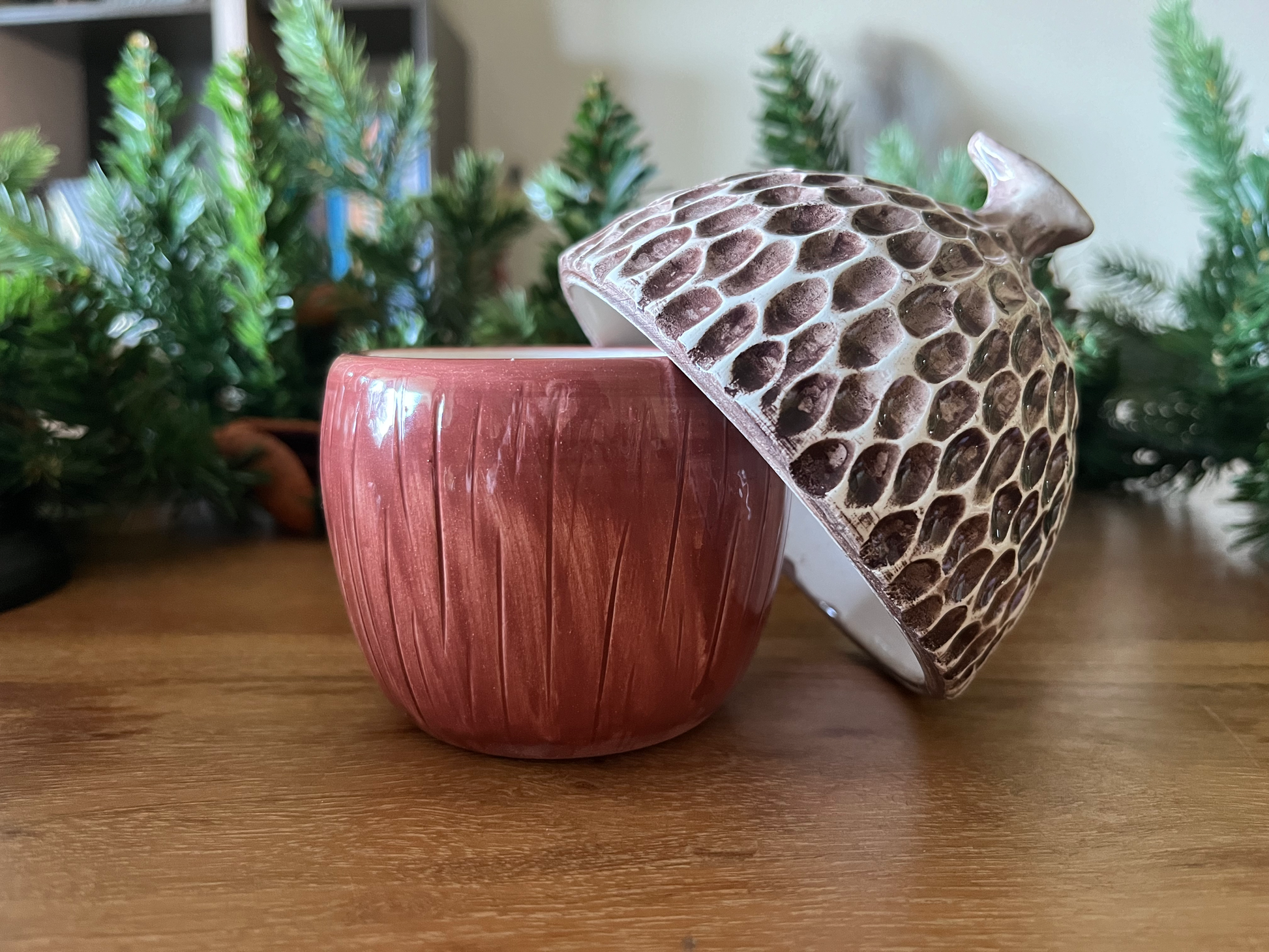 Αγκαλιάστε τη μαγεία της εποχής με το κεραμικό μας βελανίδι, ένα απολαυστικό χριστουγεννιάτικο δώρο -σε δύο χρώματα- που ενσαρκώνει τη μαγεία της εποχής. Αυτό το όμορφα κατασκευασμένο κομμάτι έρχεται σε δύο μέρη, το καθένα γεμάτο με τη δική του γοητεία. Το πάνω μέρος, διακοσμημένο με ιδιαίτερα σκαλίσματα, συμβολίζει την υπόσχεση για νέα ξεκινήματα. Αλλά είναι και το κάτω μέρος που κρύβει ένα γλυκό μυστικό - πρόκειται για μια "φωλιά" για τις αγαπημένες σας λιχουδιές. Είτε πρόκειται για μια χούφτα σοκολάτες, είτε για σπιτικά μπισκότα, είτε ακόμα και για ένα χειρόγραφο μυστικό σημείωμα, αυτό το βελανίδι είναι ένα δοχείο με εκπλήξεις. Μοιραστείτε τη ζεστασιά και τη χαρά των γιορτών με ένα δώρο που αποτυπώνει την ουσία του να δίνεις και να παίρνεις.